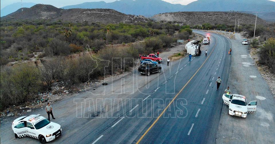 Jaumave, Tamaulipas.- Un tractocamión doble articulado con auto tanques cargados con más de 60 mil litros de diésel, volcó esta tarde en el kilómetro 137 de la carretera federal 101 tramo Victoria-Tula, a la altura del Ejido San Antonio.