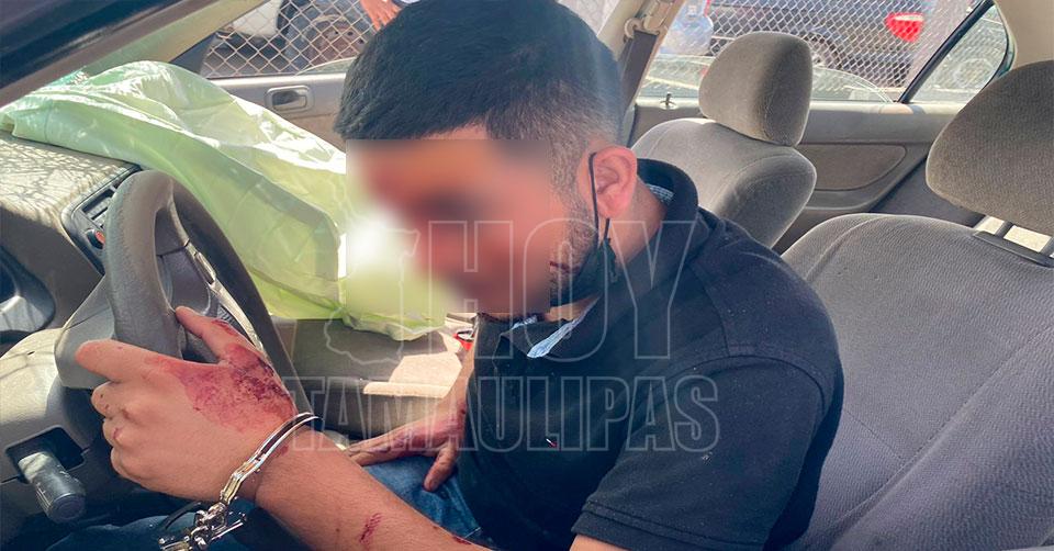 Matamoros, Tamaulipas.- Un alcoholizado taxista salió lesionado luego de estrellar el auto de ruta que conducía contra una camioneta estacionada frente al edificio de la Secretaría de Seguridad Pública de Matamoros.