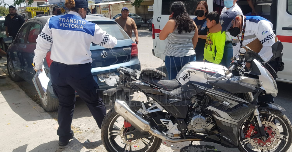 Ciudad Victoria, Tamaulipas. - Tres personas lesionadas fue el saldo que dejó un percance vial luego de que una motocicleta chocara un automóvil, derrapara y atropellara a un niño acompañado de su abuela en Ciudad Victoria.