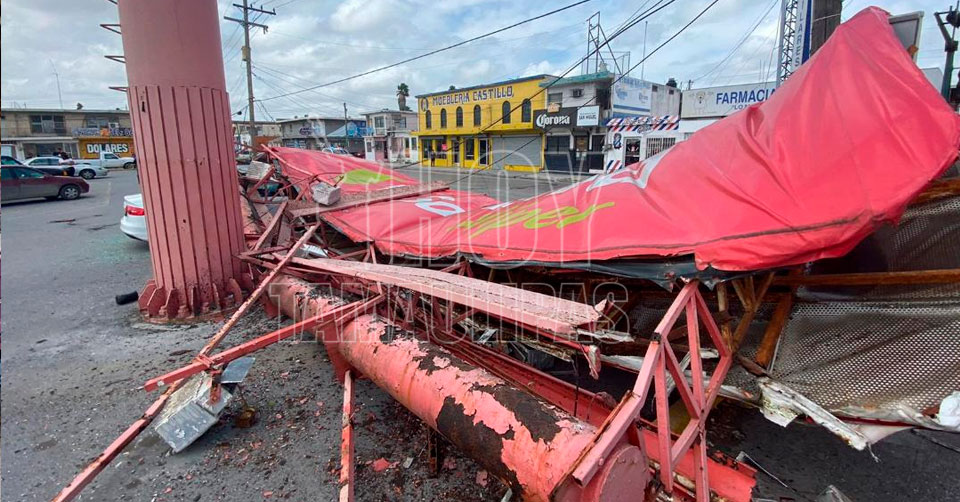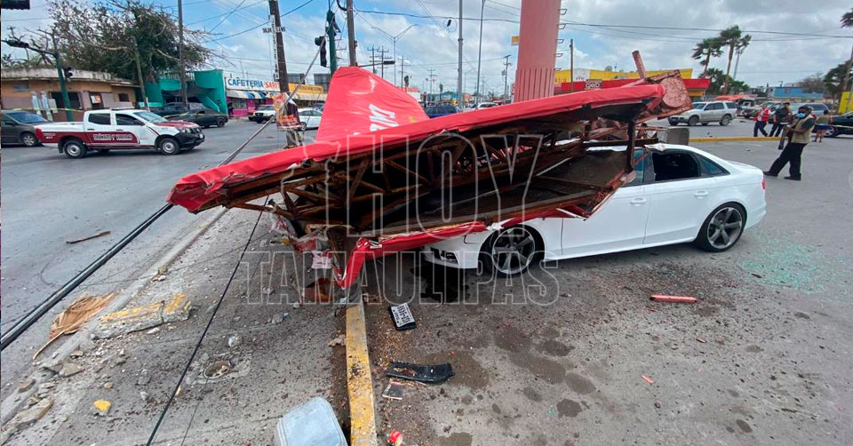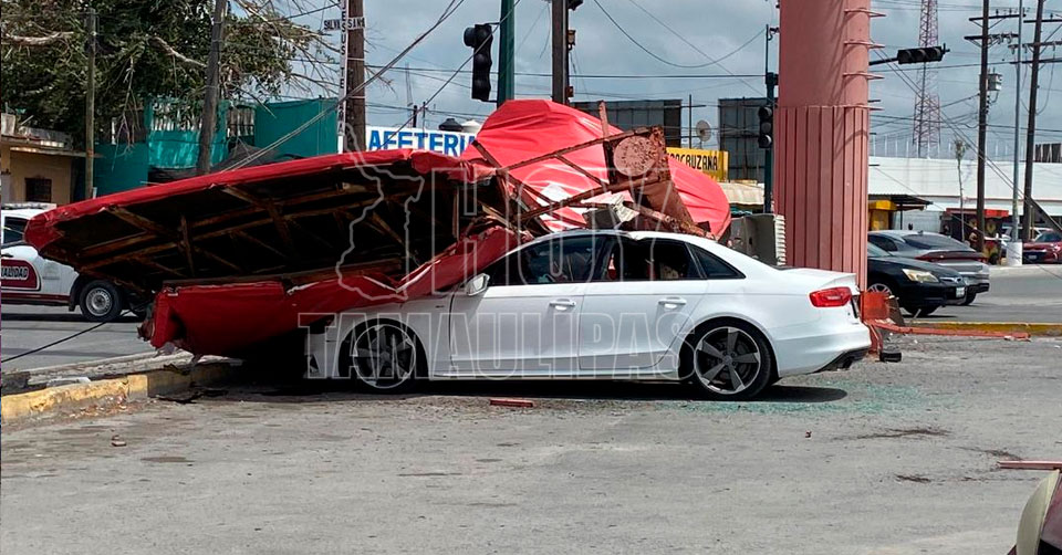 Matamoros, Tamaulipas. - Las fuertes ráfagas de viento y el desgaste fueron las causas para que la estructura del anuncio de Soriana de la Canales en Matamoros se viniera abajo y cayera sobre un vehículo, donde no había tripulantes.
