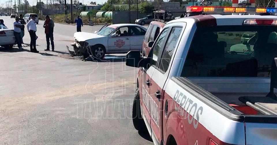 Matamoros, Tamaulipas.- El conductor de un vehículo taxi provocó un fuerte choque al cruzar sin precaución la avenida Lauro Villar, y por fortuna no se reportaron personas lesionadas, solamente daños materiales.