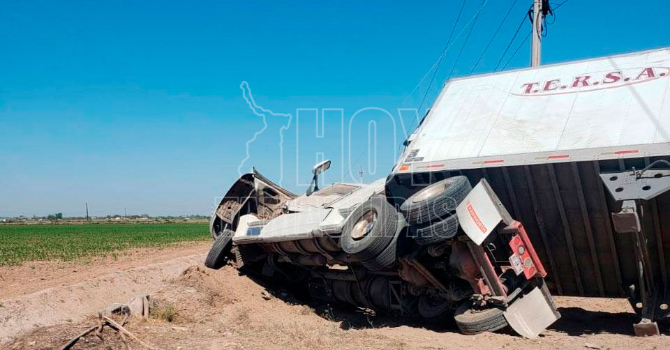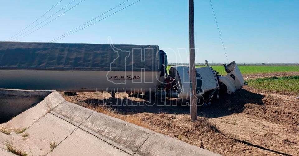 Miguel Alemán, Tamaulipas. – Un tractocamión articulado con un remolque de refrigerados volcó esta mañana en la carretera La Ribereña, a la altura del Poblado Guardados de Abajo en el municipio de Miguel Alemán, resultando su chofer con lesiones menores.