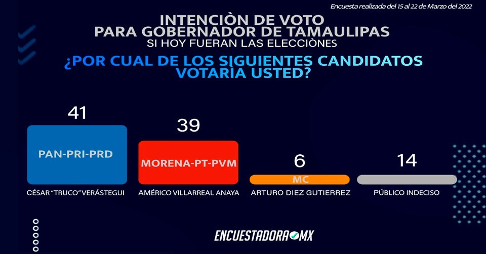 En esta encuesta, Américo Villarreal Anaya de MORENA crece su ventaja con un 49.1 por ciento de intención de voto, contra su más cercano competidor de la alianza PRI-PAN-PRD, Cesar Verastegui, que cuenta con el 20.5 por ciento.
