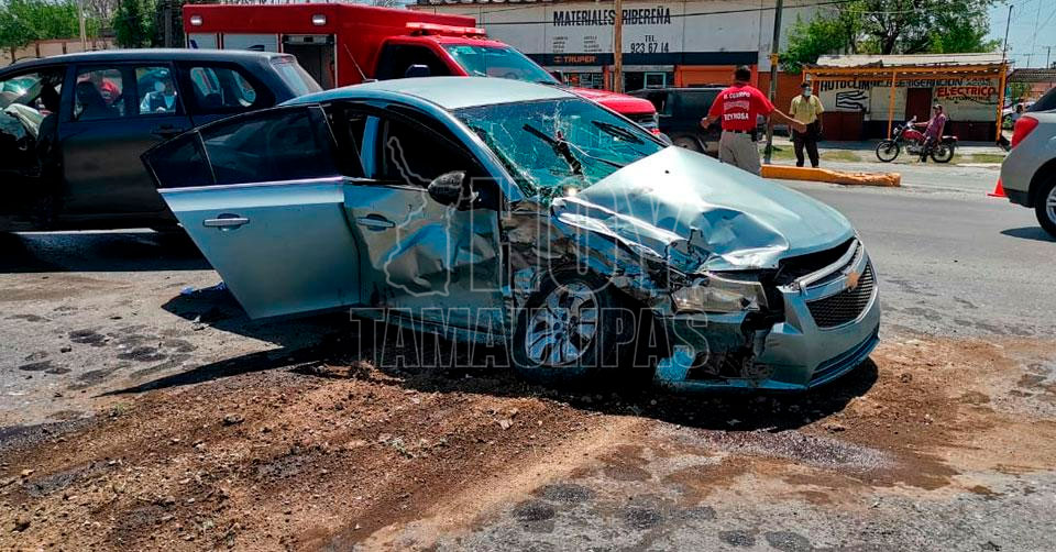 Reynosa, Tamaulipas. – Al menos cinco personas resultaron lesionadas, entre ellas un menor con lesiones graves, tras registrarse un fuerte choque la tarde de ayer domingo en la calle Adolfo López Mateos y la carretera Ribereña en la colonia Vicente Guerrero en Reynosa.