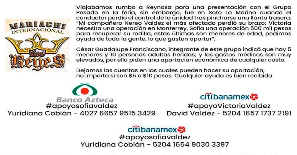 "Viajabamos rumbo a Reynosa para una presentación con el Grupo Pesado en la feria, sin embargo, fue en Soto La Marina cuando el conductor perdió el control de la unidad tras pincharse una llanta trasera. "Mi compañero Nereo Valdez el más afectado perdió su brazo; Victoria necesita una operación en Monterrey, Sofia una operación 500 mil pesos para recuperar su rodilla, estas últimas son menores de edad, pedimos ayuda de toda la gente, lo que gusten aportar",