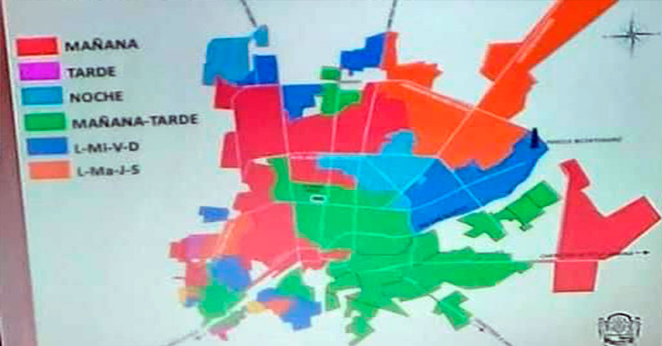 El plan contempla dividir la ciudad en horarios o días de servicio, teniendo en color rojo las zonas que tendrán líquido durante la mañana, en morado será el horario vespertino, en celeste y verde aquellas que tendrán agua en la mañana y en la tarde.