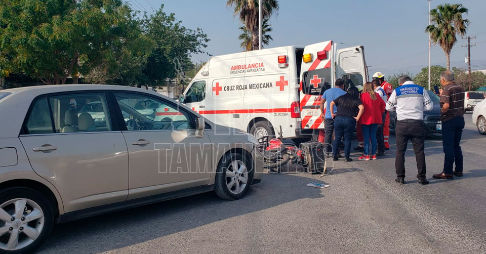 Ciudad Victoria, Tamaulipas. – Un motociclista resultó lesionado esta mañana luego de ser embestido por un automóvil conducido por una mujer en la Avenida José Sulaimán y calle Artículo 32, frente al Motel Plaza en Ciudad Victoria.