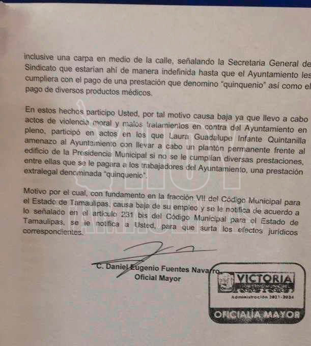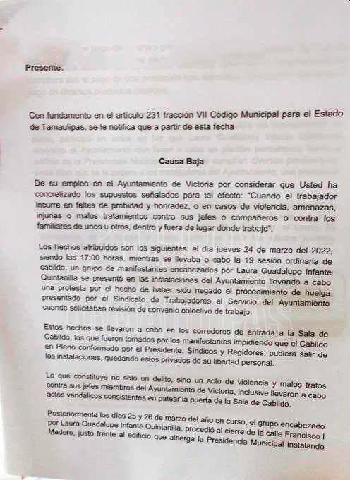 “Con fundamentó en el artículo 231 Fracción VII del Código Municipal para el Estado de Tamaulipas se le notifica que a partir de esta fecha causa baja”, relata el oficio.