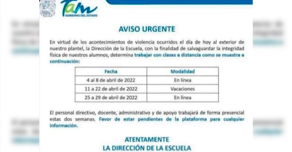 Reynosa, Tamaulipas.- Los directivos de la Escuela Secundaria ETI 44 de Reynosa decidieron suspender las clases presenciales a partir del 4 de abril, derivado de los hechos violentos suscitados ayer viernes afuera del plantel, donde un estudiante fue herido con arma blanca.
