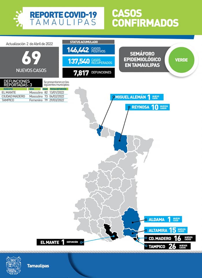 Mientras que los fallecimientos corresponden a un hombre 82 años en El Mante, un hombre de 73 años en Ciudad Madero y una mujer de 79 años de edad en Tampico.