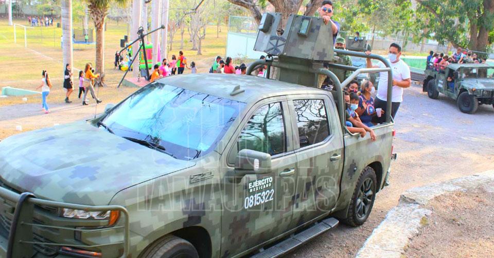 En el centro castrense los adultos, aunque principalmente los niños, estuvieron gustosos de subirse y hacer un recorrido interior en unidades del Ejército Mexicano, además de tener la oportunidad de ponerse el uniforme de campaña de la milicia.