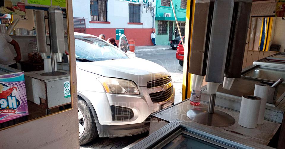 La unidad que por poco termina dentro del negocio Helami, Helados de Michoacán, es una camioneta Chevrolet Trax color gris con placas del Estado de Tamaulipas.