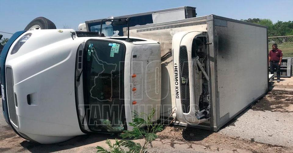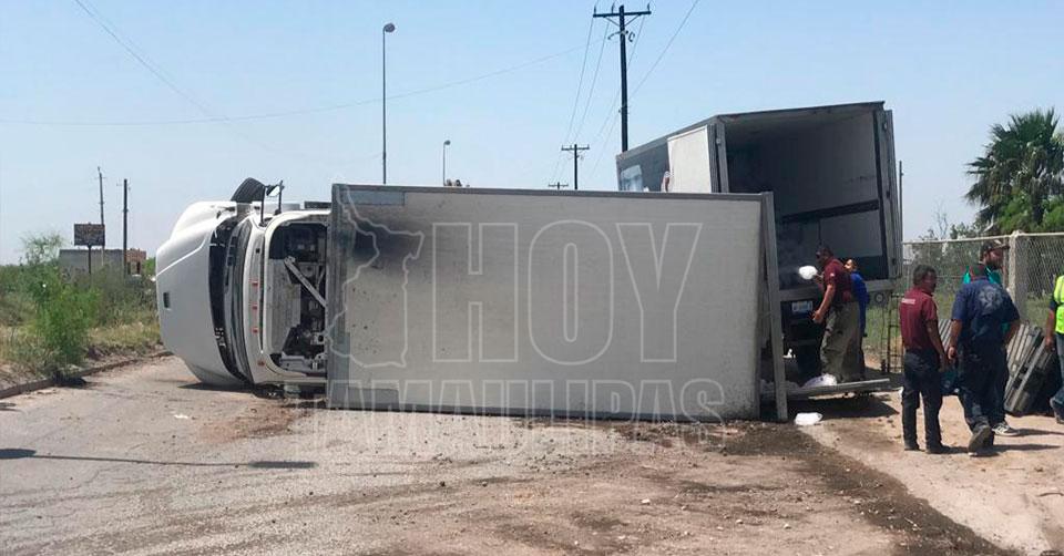 Matamoros, Tamaulipas.- El operador de un camión de la empresa Blanquita resultó lesionado tras volcar la pesada unidad motriz, al perder el control de volante luego de que frenó para evitar colisionar.