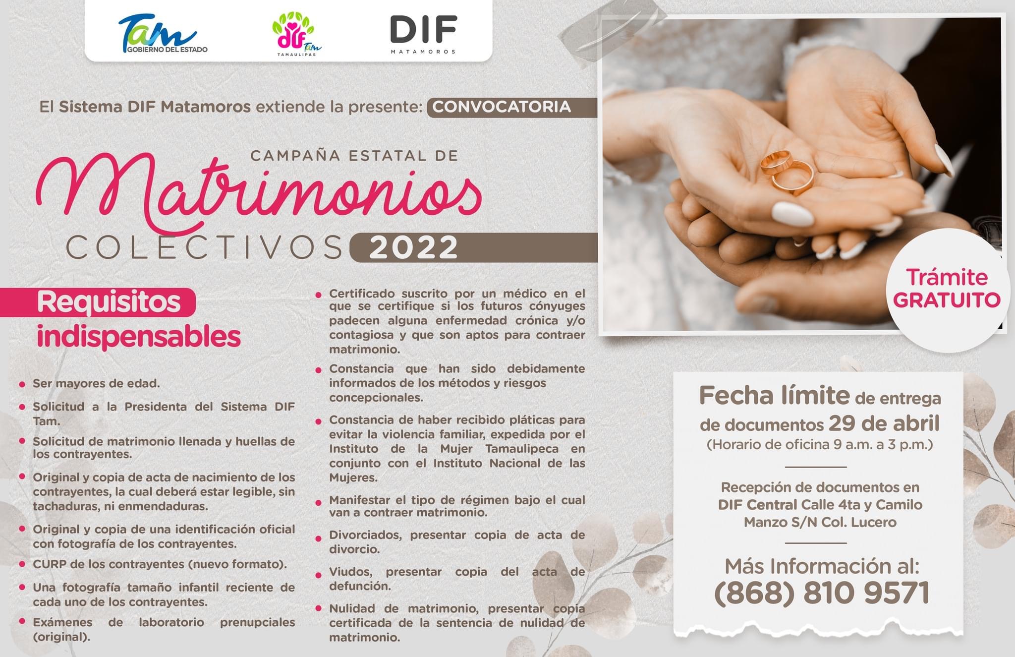 Manifestó que el Sistema DIF Matamoros, en coordinación con el Estatal y las oficialías del Registro Civil estarán llevando a cabo el programa de campaña de matrimonios colectivos durante todo el mes de abril.