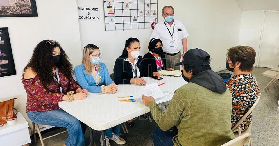 Personal del Sistema DIF local, estatal, del Registro Civil y del Instituto Estatal de la Mujer atendiendo a una pareja que desea casarse