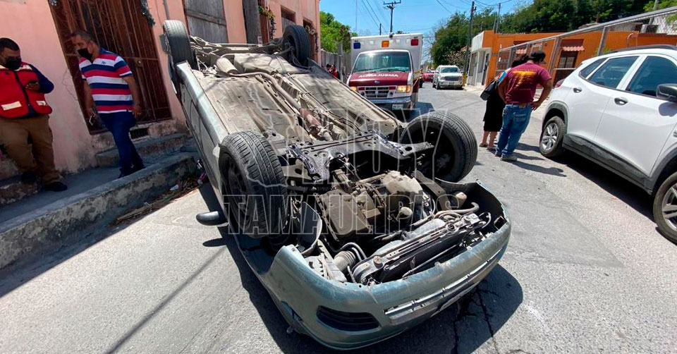 Matamoros, Tamaulipas.-La conductora de un vehículo chocó y volcó en la Zona Centro de Matamoros, presuntamente porque se le bajó la presión y por eso perdió el control del volante.