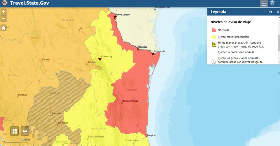 En su mapa “Advertencias de Viaje” el gobierno estadounidense marcó a Tamaulipas en color rojo, como un nivel alto de inseguridad durante la estancia en esta entidad.