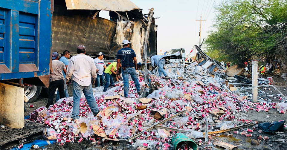 Ciudad Victoria, Tamaulipas. - Cientos de lugareños que viven a bordo de la carretera Zaragoza-Victoria, a la altura del kilómetro 42, rapiñaron la carga de cerveza que transportaba un tráiler doble articulado.