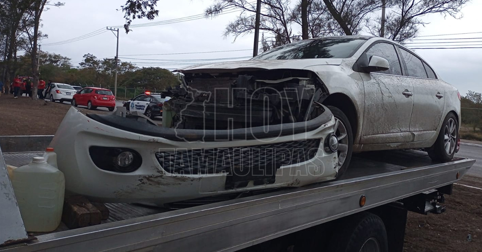 La unidad motriz que terminó prácticamente destrozada, es un carro Renault Fluence color blanco con placas de circulación del Estado de Tamaulipas.