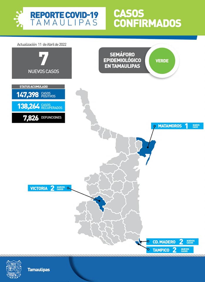 Ciudad Victoria, Tamaulipas.- En Tamaulipas se inició la semana con siete nuevos contagios de Covid-19 y ninguna muerte reportada por complicaciones derivadas de la enfermedad, confirmó la Secretaría de Salud Estatal.