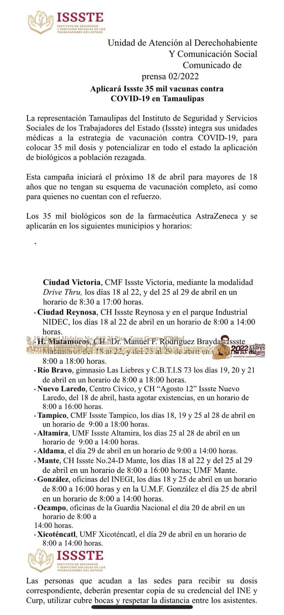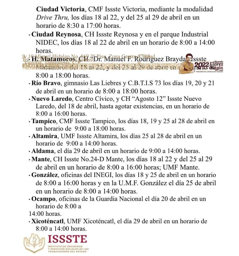 -Ciudad Victoria, CMF Issste Victoria, mediante la modalidad Drive Thru, los días 18 al 22, y del 25 al 29 de abril en un horario de 8:30 a 17:00 horas.