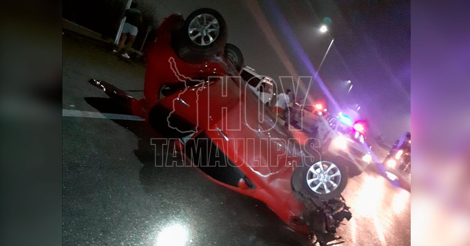 Altamira, Tamaulipas.- Una joven que conducía su automóvil con aparente exceso de velocidad resultó ilesa de forma milagrosa, después de impactarse contra un barandal metálico y terminar la unidad volcada en Altamira.