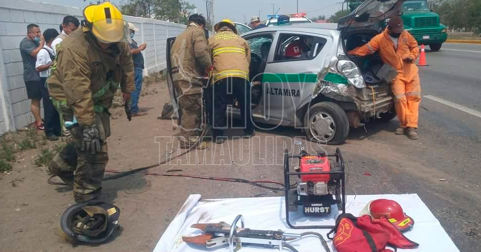 Altamira, Tamaulipas. - Tres pasajeros de un carro que cubría la ruta Tampico-Altamira resultaron heridos y quedaron prensados dentro de la unidad al impactarse el vehículo contra una barda, siendo rescatados por cuerpos de emergencia que emplearon las llamadas "quijadas de la vida".