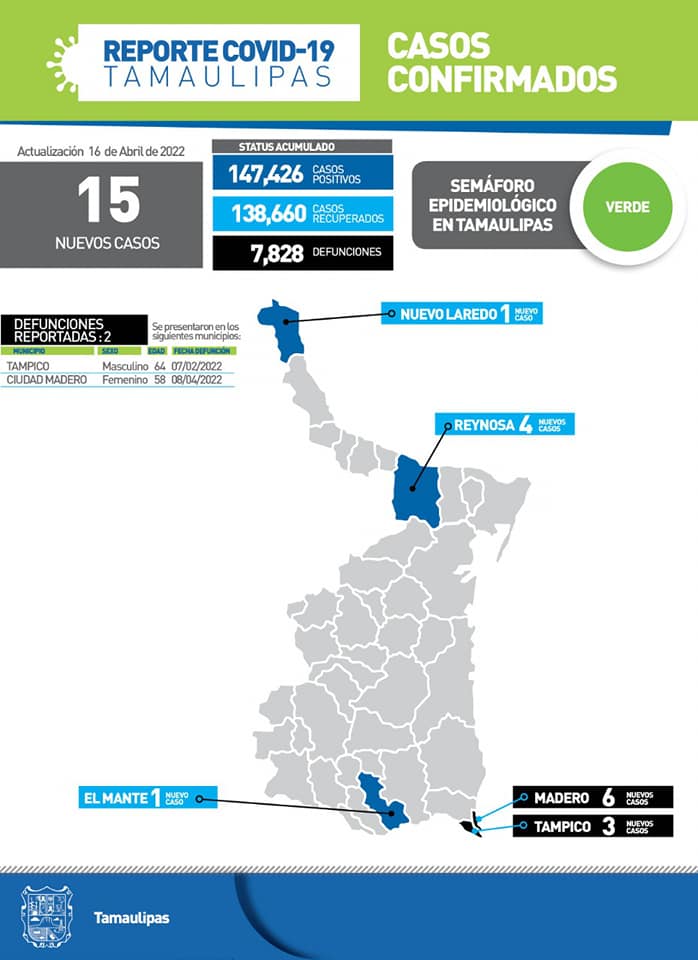 Mientras que los fallecimientos se registraron en Tampico, un hombre de 64 años y Ciudad Madero una mujer de 58.