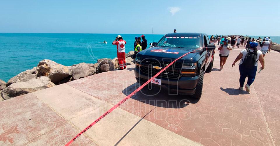 Ciudad Madero, Tamaulipas.- Cuerpos de emergencia buscan a un hombre que estaba en el agua y desapareció durante la mañana de este domingo de Pascua.