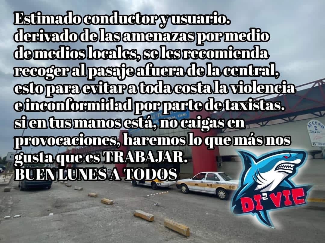 “Estimado conductor y usuario. Derivado de las amenazas por medio de medios locales, se les recomienda recoger al pasaje afuera de la central, esto para evitar a toda costa la violencia e inconformidad por parte de taxistas. Si en tus manos está, no caigas en provocaciones, haremos lo que más nos gusta que es TRABAJAR”, se lee en la imagen publicada en el grupo de Facebook por el usuario Didi Vic.
