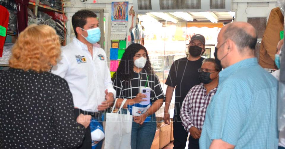 Reynosa, Tamaulipas.- César Augusto Verástegui Aranda, hijo del candidato de la alianza “Va por Tamaulipas” PAN-PRI-PRD, recorrió esta tarde los casi 200 establecimientos comerciales de la calle peatonal Hidalgo, con el propósito de dar a conocer el perfil de su padre.