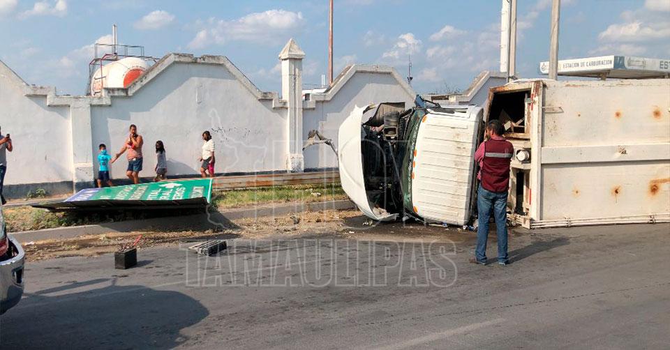 Reynosa, Tamaulipas. – Cuatro trabajadores resultaron lesionados esta tarde tras registrarse la volcadura de un camión de basura, en el Libramiento Monterrey-Matamoros.