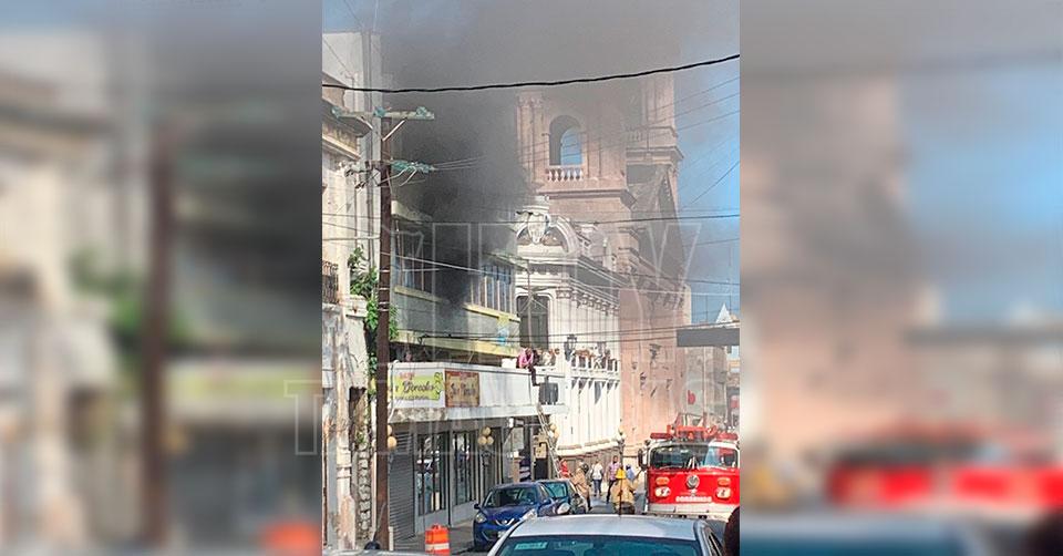 El siniestro ocurrió la tarde de este martes en el inmueble ubicado en la esquina que forman las calles Carranza y Cristóbal Colón, contra esquina de la Plaza de Armas y frente al Palacio Municipal, zona que fue cerrada a la circulación para el libre trabajo de los cuerpos de emergencia.
