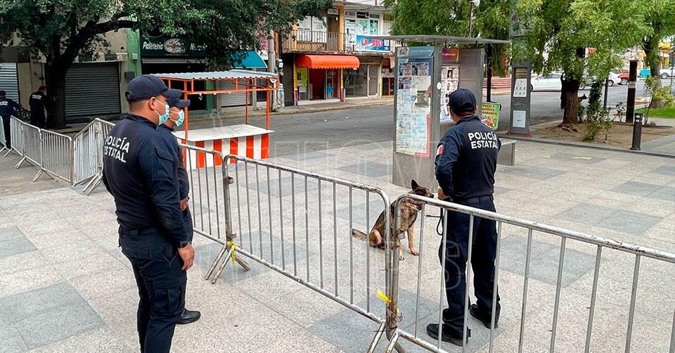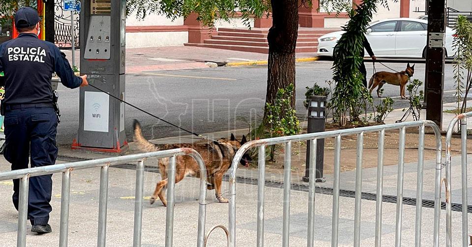 Es así que policías estatales acompañados de binomios caninos vigilan los alrededores, donde además sirvió para evitar que las feministas que realizaron una manifestación pacífica llegaran al área.