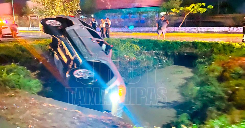 Ciudad Victoria, Tamaulipas. - Dos personas resultaron lesionadas esta noche luego que la camioneta en la que viajaban volcara y cayera a un dren pluvial, en el Eje Vial Lázaro Cárdenas, debajo de "La Joroba".