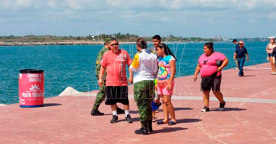Ciudad Madero, Tamaulipas. - Acompañados de los marcianos de la Playa Miramar, personal de salud de la Secretaría de la Defensa Nacional (Sedena) pide a la población acudir a los módulos de vacunación contra el coronavirus en Tamaulipas.