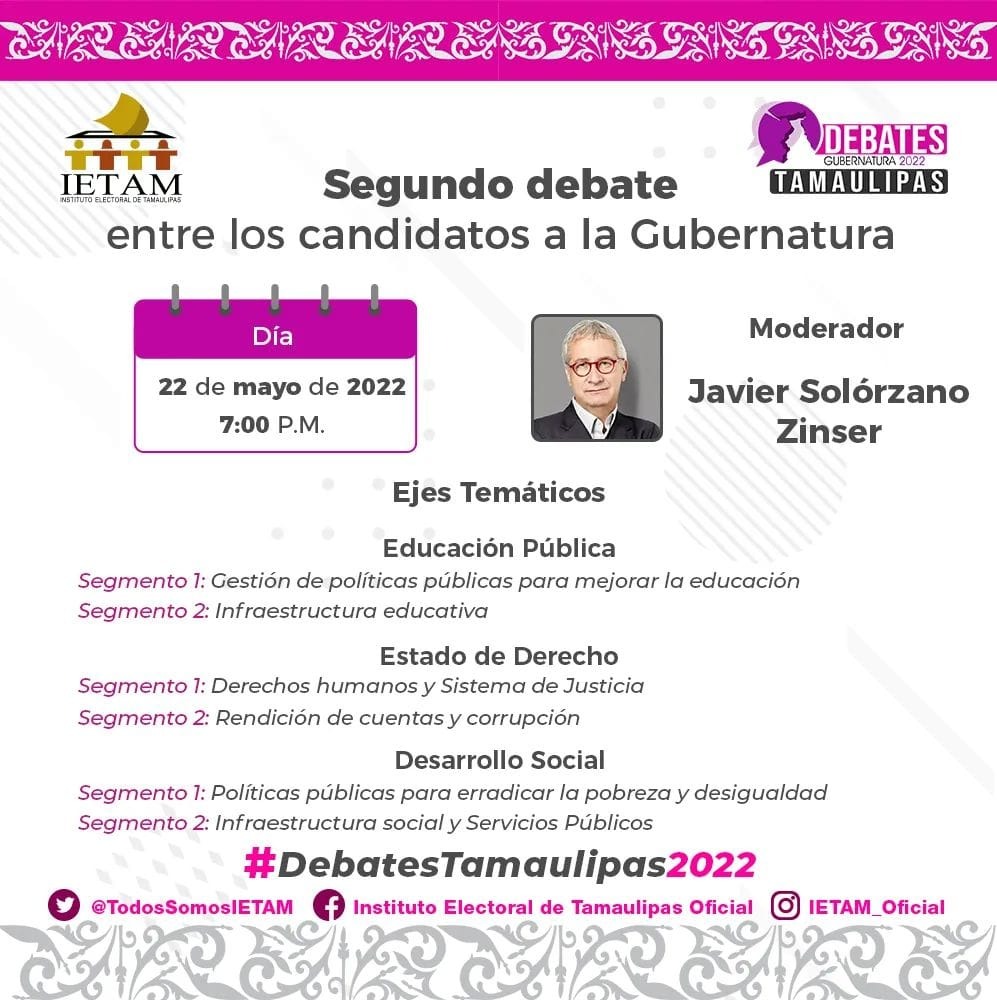 Ciudad Victoria, Tamaulipas. – El Instituto Electoral de Tamaulipas (Ietam) determinó que los ejes temáticos para discutir en el segundo debate entre candidatos a gobernador del Estado serán Educación, Estado de Derecho, y Desarrollo Social.