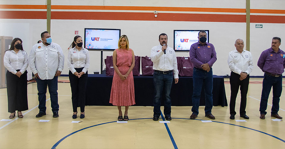 En el evento, el Rector estuvo acompañado de su esposa, la C. P. Imelda Sustaita de Mendoza; el Ing. Rafael Pichardo Torres, Secretario de Administración; la Mtra. Mirna Dalia Saavedra Merrem, Directora de Recursos Humanos; así como de Óscar Valdez Ávila, Secretario General estatal del SUTUAT, y Raymundo Tadeo Suarez, secretario de la Sección Centro.