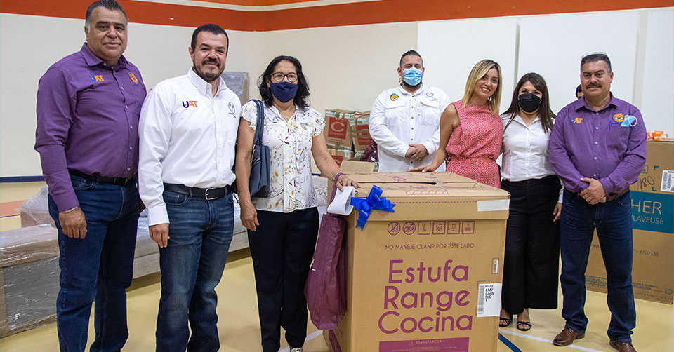 En el evento realizado en el Gimnasio Multidisciplinario de Victoria, el Rector Mendoza Cavazos entregó a las ganadoras de la Sección Centro del SUTUAT los obsequios del reciente sorteo realizado en beneficio de las madres trabajadoras sindicalizadas que laboran en las diferentes dependencias de la Universidad.