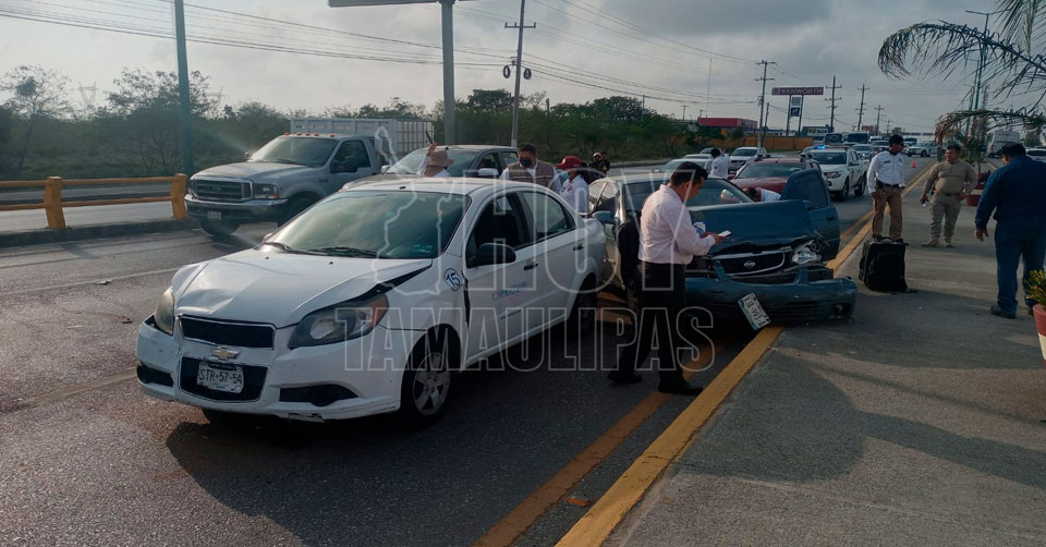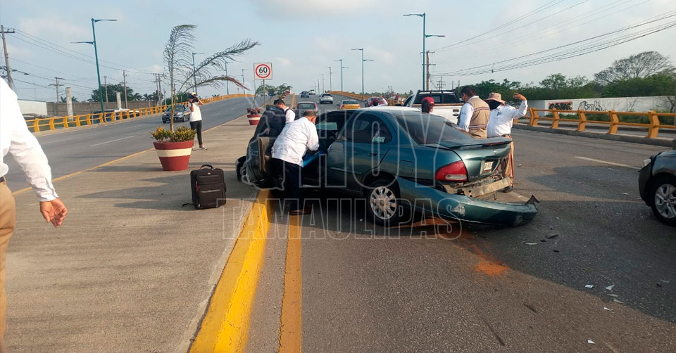 Altamira, Tamaulipas. - Un fuerte choque por alcance en el que participaron tres vehículos dejó como saldo una persona lesionada, cuantiosos daños materiales y congestionamiento vial sobre la Avenida de la Industria en dirección norte a sur, a la altura del acceso al puente del paso a desnivel conocido como “El Barquito” en Altamira.