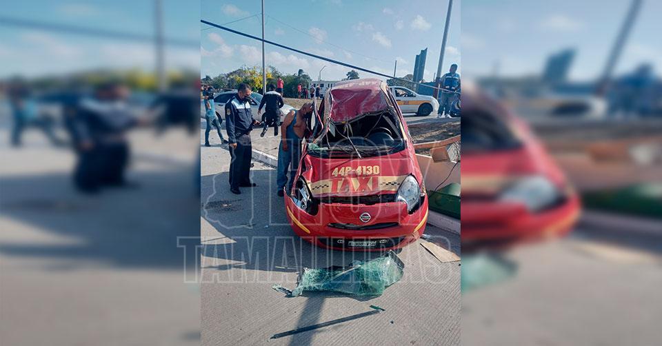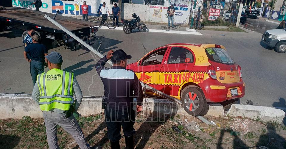 Tampico, Tamaulipas. - Un taxista que se encontraba en aparente estado de ebriedad provocó un fuerte accidente vial esta tarde al colisionar con una camioneta, volcando su vehículo que derribó a su paso un poste y un semáforo, en el cruce que forman la Avenida Monterrey y calle Francia, frente a la colonia Solidaridad Voluntad y Trabajo, conocida como La Borreguera.