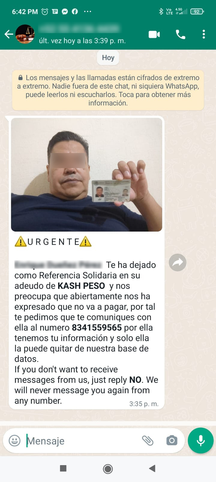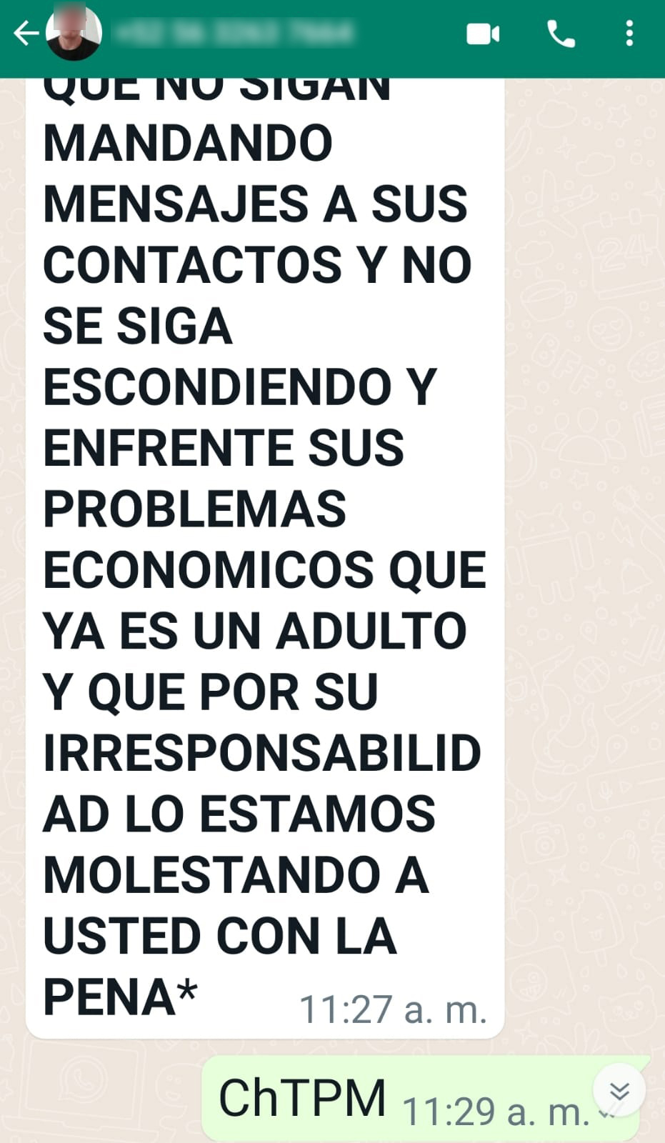 Desde hace varios días se están recibiendo mensajes vía WhatsApp en donde avisan que un contacto personal tiene un adeudo con la supuesta empresa que envía los mensajes, en los que se insulta con malas palabras a la persona que supuestamente solicitó un préstamo y que no quiere pagar, y que como referencia dejó el número telefónico de quien está recibiendo el mensaje y a quien le piden lo localice y terminan ofreciéndole un préstamo.