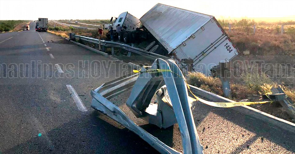 Nuevo Laredo, Tamaulipas.- Un chofer de tractocamión acabó herido al chocar contra un barandal de contención en la Carretera Nacional Libre, en Nuevo Laredo.