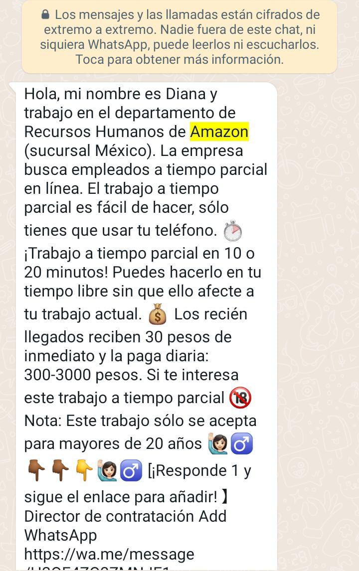 Nuevo Laredo, Tamaulipas.- A través de WhatsApp están llegando mensajes a cientos de personas sobre supuestos trabajos en la empresa Amazon.
