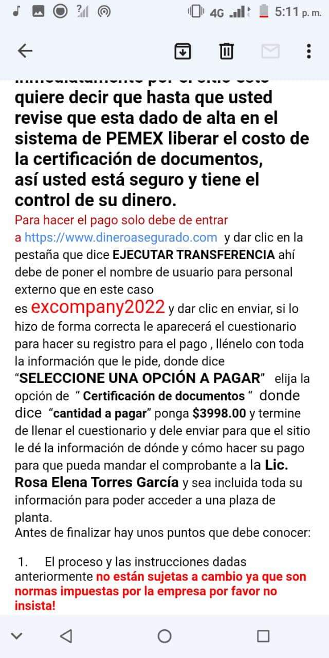Y es que en el correo electrónico que se está enviando a algunos trabajadores les avisan que fueron seleccionados para otorgarles una plaza en Petróleos Mexicanos (Pemex), pero para poder realizar todos los trámites deberá enviar cierta cantidad de dinero.
