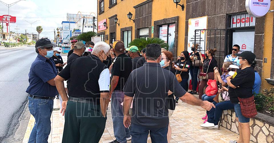 Matamoros, Tamaulipas.- El grupo de víctimas del Infonavit, protestaron ante las oficinas de este instituto, para exigir a los delegados y reclamar que sus deudas no las han convertido de “Veces Salario Mínimo” a “Pesos” y que algunos ya tienen más de 20 años pagando sus casas.