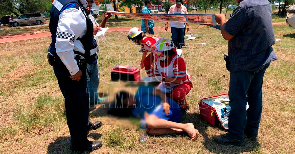 El lesionado iba en un Spark Cesia en sentido de sur a norte sobre Emilio Portes Gil, pero a la altura de Naciones Unidas perdió el control y terminó volcando.