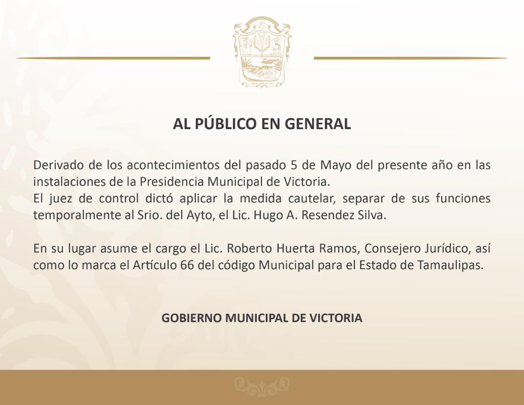 Ciudad Victoria, Tamaulipas. - Un juez de Control dictó medidas cautelares en contra del secretario del Ayuntamiento de Victoria, Hugo Arael Reséndez Silva, y por tal motivo dejó de ejercer funciones.