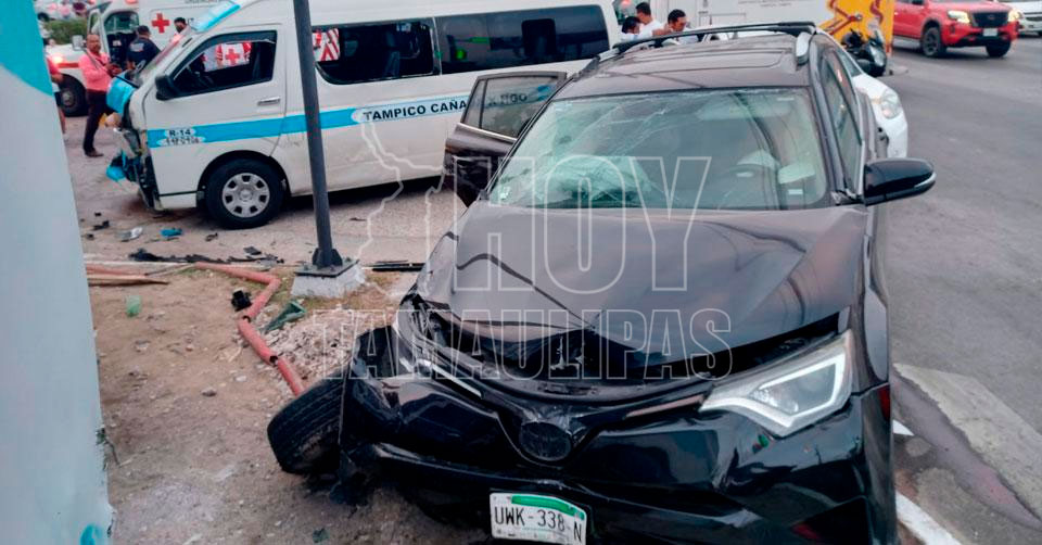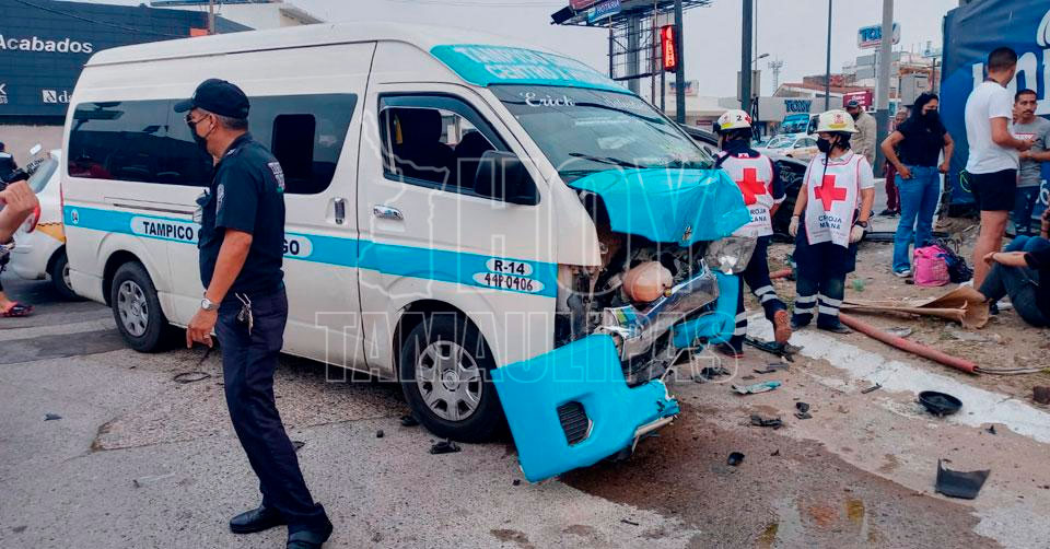 Tampico, Tamaulipas. - Un saldo de siete personas lesionadas y cuantiosas pérdidas materiales, dejó un fuerte accidente vial protagonizado por quien conducía una camioneta de modelo reciente y una tipo “combi” que cubría la ruta Cañada – Centro en Tampico.