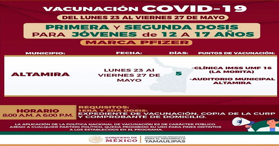 Altamira, Tamaulipas. - Autoridades federales confirmaron que a partir del lunes 23 y hasta el viernes 27 de mayo se estarán aplicando las vacunas contra el coronavirus a jóvenes de 12 a 17 años de edad en Altamira.